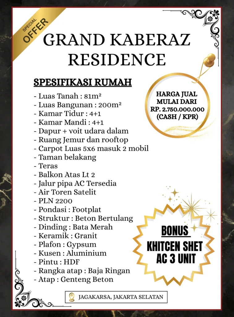Grand Kaberaz Residence hadir sebagai pilihan hunian eksklusif di kawasan strategis Jagakarsa, Jakarta Selatan. Dengan desain modern dan spesifikasi premium, rumah ini menawarkan kenyamanan maksimal bagi Anda yang menginginkan hunian berkualitas dengan akses mudah ke berbagai fasilitas kota.